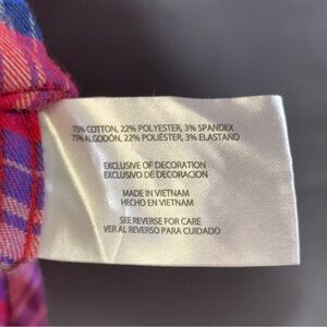 Features: Collared neckline; full button front; single chest pocket with bias-cut plaid; adjustable two-button cuffs; curved hem; back yoke