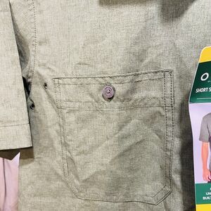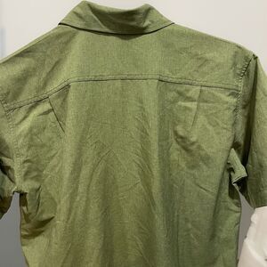This Orvis button-up shirt is a terrific basic with the extra of being great for outdoors and adventure. The shirt features short sleeves, a collared neckline, and a solid pattern in a classic army green color. It is made of high-quality polyester material and has a woven fabric type, ensuring both comfort and durability.