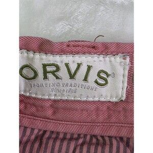 The Orvis Men's Flat Front 100% Cotton Twill Chino Shorts in Coral are a stylish and comfortable choice for outdoor casual wear. These shorts feature a zip closure, slash pockets, and unique branded buttons. The cotton twill fabric is medium washed and gives a classic solid color look perfect for the summer, fall, and spring seasons. With a regular fit and size 36 waist, these shorts are a versatile addition to any man's wardrobe, suitable for travel and everyday casual occasions.