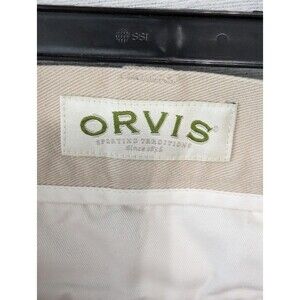 Men's Orvis Sporting Traditions Tan Khaki Leather Trim Pants Jeans. These pants are designed to withstand rugged outdoor activities while providing comfort and style. Designed for comfort, these pants have a relaxed fit with a comfortable waistband. Ideal for hunting, hiking, and other outdoor activities.