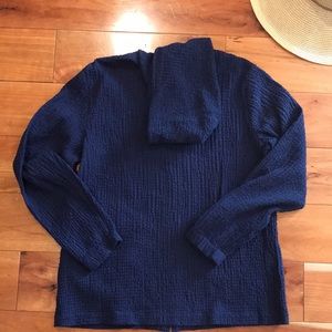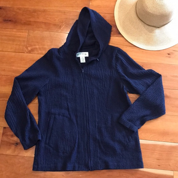 This jacket Is ultra comfortable, it has a lot of stretch to it. The fabric is crêpe like. It has side pockets and a hood. The condition is excellent!!