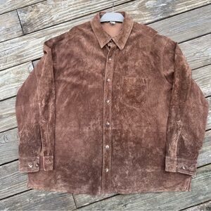 Stylish brown suede button-up shirt with a classic collar and front pocket.