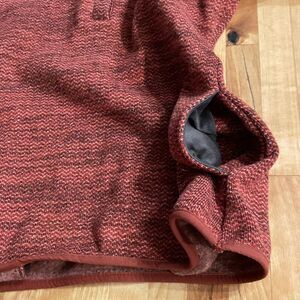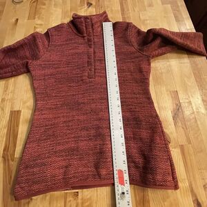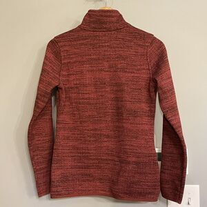 This Orvis sweater is a must-have for any woman's wardrobe. It features a mock neck with a 1/4 button fleece pullover design, perfect for staying active outdoors. The sweater comes in a beautiful red color and is made from polyester material with a knit fabric type.