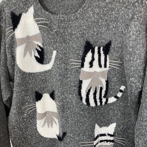 Features a whimsical repeated cat motif with black and white striped and spotted cats, each accented by a taupe bow. Large cat graphics are knit into the sweater, perfect for animal lovers or a fun, quirky look.
