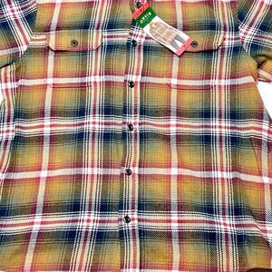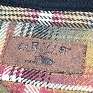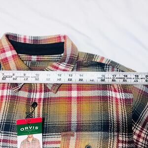 Introducing an Orvis heavyweight flannel shirt in men's medium, featuring a tan plaid pattern with black white and red. This long sleeve button-down shirt is brand new.