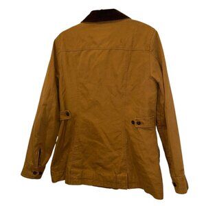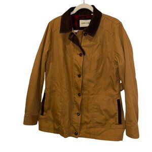 Stylish utility jacket by Orvis. Features a tan exterior with a brown collar. Red and black plaid lining adds a classic touch. Perfect for versatile wear. Just have too many jackets!