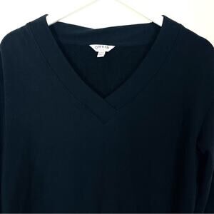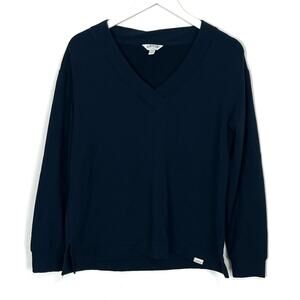 Banded v-neckline, hem, and cuffs. Dropped shoulders.