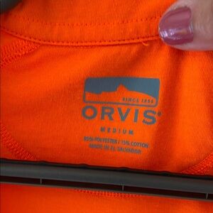 Vibrant orange pullover by Orvis. Features a stylish 1/4 zip design.