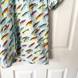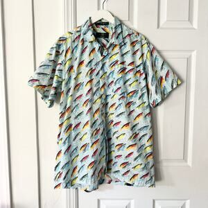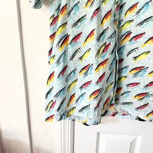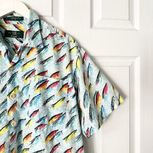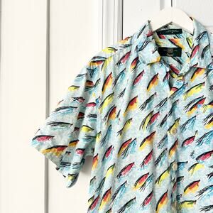 Size medium from Orvis. Vintage made in Hong Kong. Cotton. Light blue button down collared camo shirt with multicolored fly fish tackle print throughout. Preowned. Some wear along inner neckline. See photos. Does not affect wear.