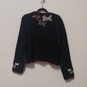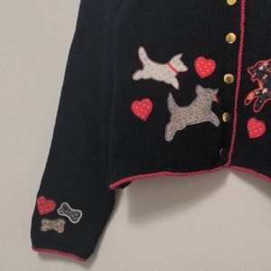 This preloved Orvis Vintage Mixed Print Dog Patch Cardigan is just too cute and perfect for dog lovers! The black cardigan has mixed print patches of dogs and bones throughout with red trimming detail and gold buttons down the front. The size tag says Medium but because it is a vintage piece, please see measurements below for additional reference.