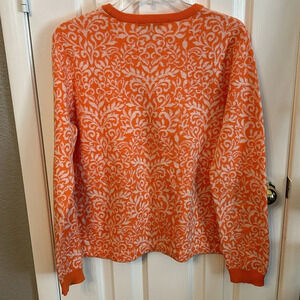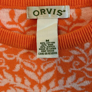 Orvis Women’s (M) Orange/White Wool Blend Pullover Floral Sweater Winter Fall. Add a touch of color to your fall wardrobe with this bright orange sweater. The soft fabric features a beautiful floral pattern. The round neckline and long sleeves make it perfect for casual wear and a classic touch to any outfit.