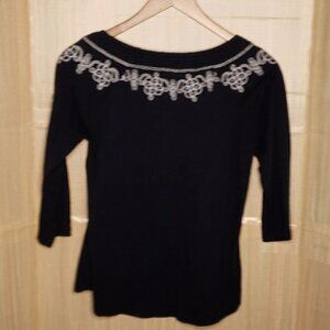 Orvis women’s navy ¾ sleeve wide elastic neckline embroidered top medium. Gently used condition. Measurements are: 25” from shoulder to hem, and 19 ½" from armpit to armpit.