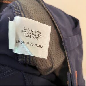 Navy blue nylon outdoor capri pants. Zip side pockets. Tapered lag with small vent. Front and back pockets.