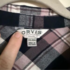 This Orvis plaid flannel shirt in a pink and blue pattern is a cozy and stylish addition to your wardrobe. Made from soft flannel, it features a classic button-down design, perfect for layering or wearing on its own for a relaxed, casual look.