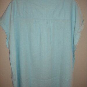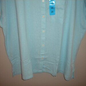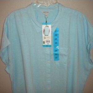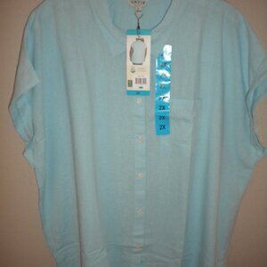 Orvis Women's Plus Size 2X Blue Linen Blend Button Short Sleeve Top NWT.