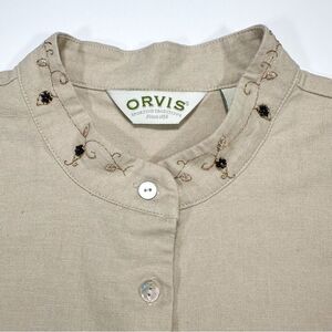 Orvis Womens Size Large Linen Blend Vintage Button Down Shirt Beaded Embroidered