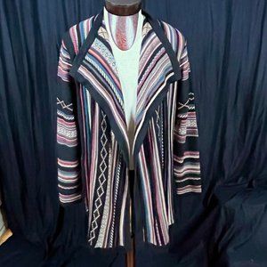 Beautiful open front cardigan from Orvis. Long length. Southwest style design with multiple colors on black.
