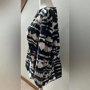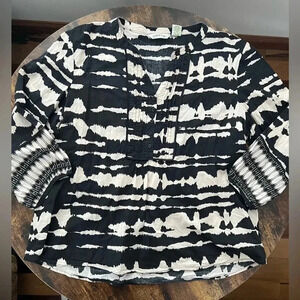 Ladies 3/4 length sleeve shirt. 5- button up front. Elastic gathered at waist on back. Lightweight. Peplum bottom. Flowy. Loose. Beautiful blouse! Very good used condition.