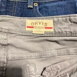 Orvis five pocket cotton blend canvas jeans men’s size 40 x 32 in grey. These casual jeans have a small amount of stretch and are perfect for working on the job, hiking, or whatever casual activities you have in mind.