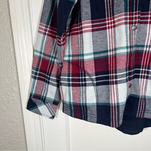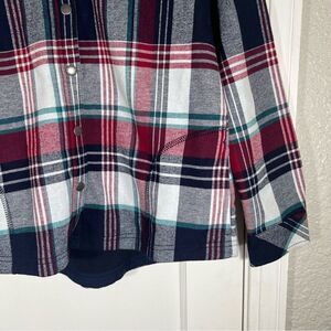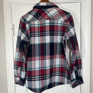 Orvis fleece lined flannel snap front shirt collared jacket. Women’s size Small. Good condition. No holes/tears/rips.