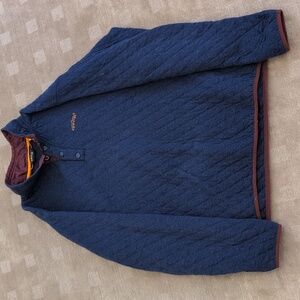 A blue quilted pullover with a button up front and a ribbed collar.