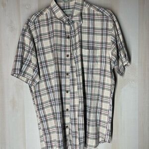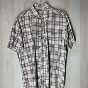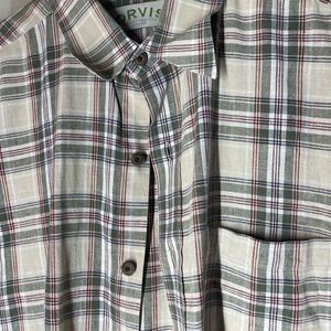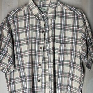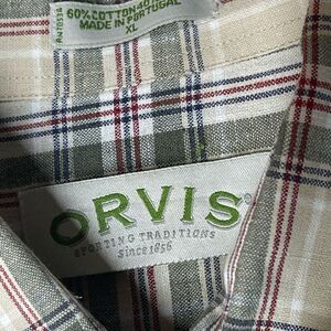 Orvis short sleeve linen blend plaid shirt beige green, size XL