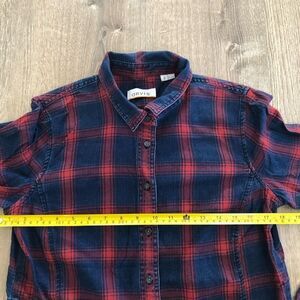 Womens Womens Long Sleeve Button Up Flannel Shirt. Size Small. Red and Blue Plaid Pattern. No rips, tears or stains. Pit-to-pit 18", Collar-to-Hem 26". 100% Cotton. See photos for condition.