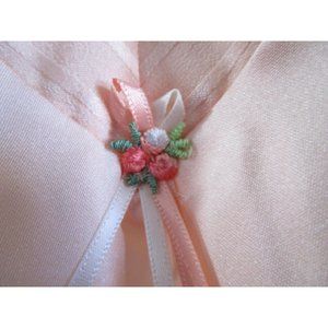 Elegant Orweco Frocks vintage chemise night gown in peach satin with damask stripe accent. Perfect for ladies wanting a touch of classic glamour for their sleepwear. Made in the USA, this small-sized piece embodies timeless style and comfort. Elastic at back has no stretch left in it. Has small black spot on front and tiny hang tag hole under left arm. Appears to be new old stock, tag shows no signs of wear or laundering. No manufactures labels, based on RN 16953 this a a vintage Orweco Frocks or Orweco Dress factory. Made before 1992 when the factory closed.