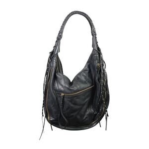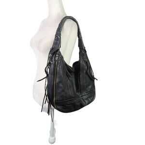 Oryany black leather slouchy hobo shoulder bag purse with fringe tassels