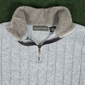 FEATURES- Textured striped waffle knit material, mock neck, quarter zip front, ribbed sleeves, ribbed hem, medium to heavy wieght, sherpa lined neckline collar