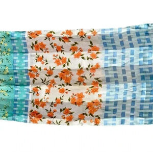 Beautiful Oscar de la Renta 100% silk scarf mixed pattern using vibrant orange , yellows and blues measurements are 51.5” in length and and 11” wide pre owned great condition
