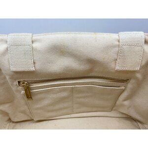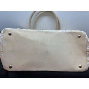 The Oscar de la Renta canvas floral tote bag exudes elegance with its beige and white floral pattern, making it a sophisticated choice for everyday use. Its spacious interior allows for ample storage, while sturdy handles ensure comfortable carrying. This bag effortlessly combines style and functionality for the modern professional.
