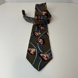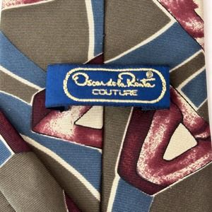 Elevate your style with this stunning designer neck tie from Oscar De La Renta. The abstract pattern features a mix of olive green, maroon, and blue, adding a touch of sophistication to any outfit. Crafted with quality materials, this tie is perfect for any occasion and is sure to impress. Whether you're dressing up for a formal event or simply elevating your everyday look, this tie is a must-have for any fashion-forward man. Excellent Vintage Neck Tie! 58" x 3 5/8".