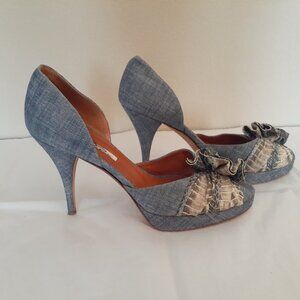 Blue chambray denim with decorative strips and pleated ruffles with python-print leather in tans and grays