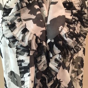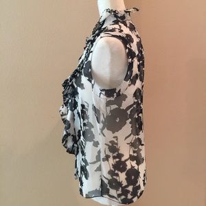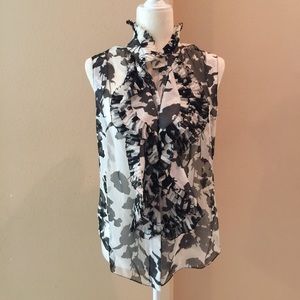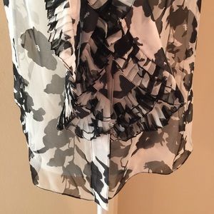 Sleeveless Silk Blouse in Floral print from Oscar De La Renta. Button front. Ruffles and pleats. Color is black and white. Loose fitting. Sheer. Some loose threads but that is from the way the Silk shirt is made. 100% Silk. Size 6. Made in USA.