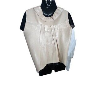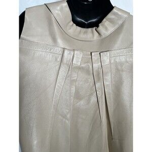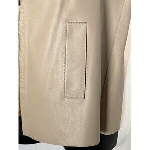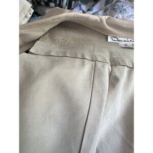 Add a touch of elegance to your wardrobe with this beautiful Oscar De La Renta leather vest. The vest features a beige color with a gold zipper closure and sleeveless design. It is made of genuine leather and has a relaxed fit, making it perfect for casual occasions. The vest also has pockets and a 1/2 zip closure.