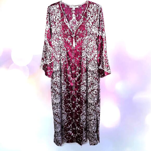Length 53; Chest (pit-to-pit) 21; Sleeve Length (from shoulder seam) 21; Shoulder Width 16. Vintage Oscar de la Renta satin kaftan robe in deep maroon with white with tassel neckline. RN# 60766. Soft, flowing fit ideal for lounging or layering. Elegant and collectible designer piece.