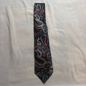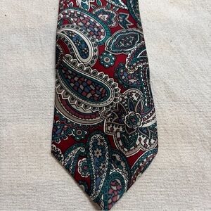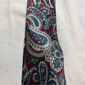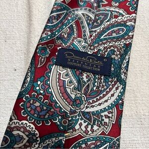 This is a designer Oscar de la Renta men's tie made of 100% silk , multicolored with a paisley pattern. It is a long tie with a classic width and adjustable features. The tie has a geometric multicolor paisley design, suitable for workwear, and was made in the United States.