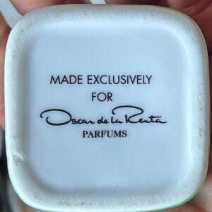 This elegantly designed trinket box features a delicate green rose pattern, crafted exclusively for Oscar De La Renta Parfums. Its compact size makes it ideal for storing small jewelry pieces or cherished keepsakes. The ceramic material ensures durability while adding a touch of sophistication.