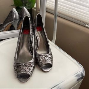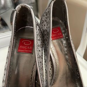Love it? Send an offer! Oscar De La Renta Silver peep toe high heels metallic leather cutouts 8.5. See all photos for condition. Although these have never been worn they do show some used condition for just sitting looking pretty in a closet. Gorgeous high quality leather with geometric floral cutouts perforated designs with a bow on top of the toes.