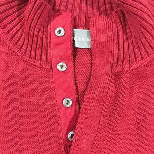 Beautiful sweater for men by Oscar De La Renta. The sweater has snap collar and is very soft. The size is XXL with measurements in the pictures. There is one tiny snag near the back of the wrist/arm area, see the pictures for more details. Overall good condition.