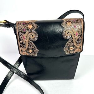Oscar De La Renta Studio Black Leather Crossbody Shoulder Bag Purse Embroidered
