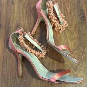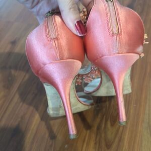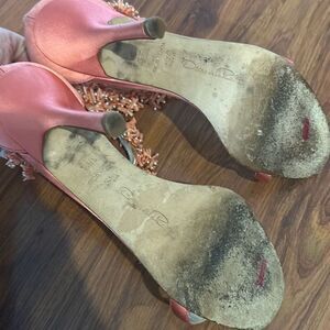 previously worn satin has some blemishes and signs of wear. Bottom of shoe has some blemishes
