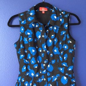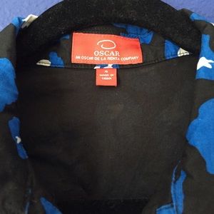 Oscar an Oscar De La Renta Company midi flare dutton down dress with collar. Black, blue and white leopard print. Black lining. Shell: 97%cotton/ 3%spandex. Lining: 100%cotton. Very flattering dress. It looks more flared when worn, reminds me of an updated 50's look. Smoke free, pet free home.