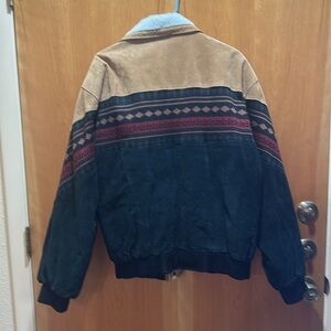 Preowned. Vintage Leather Bomber Style Jacket. Logo snaps. 2 front pockets. Aztec design. Sherpa Fur lining. 24” pit to pit and 28” across.
