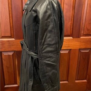 Oscar Piel Leather coat perfect for any occasion from travel to business to casual outings. Crafted with high-quality leather, this mid-length jacket features long sleeves and a zipper and tie belt closure. The black jacket is accented with a logo snaps, zipper, etc, giving it a classic and retro feel.