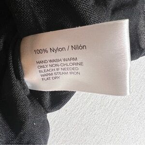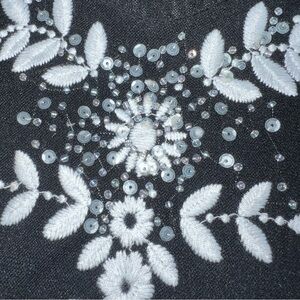 Layers of tight black mesh, embellished with white floral embroidery, iridescent beads and sequins. Scoop v-neck and 3/4 sleeves. Lettuce hemline.