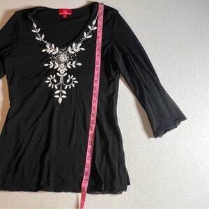 Oscar by Oscar De La Renta Long Sleeve Beaded Embroidered Black Mesh Top, Large