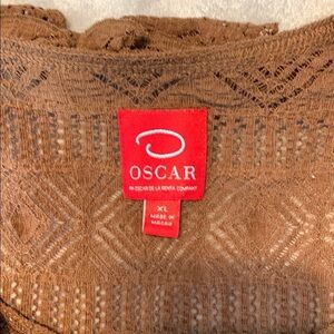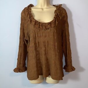 Oscar by Oscar De Larenta Brown Lace mesh Top blouse scoop neck ruffle trim XL