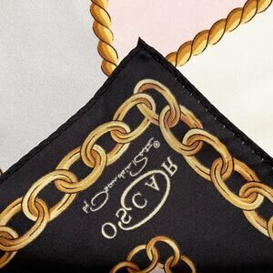 Twill scarf with multicolored patchwork and chain print, signed in corner.
